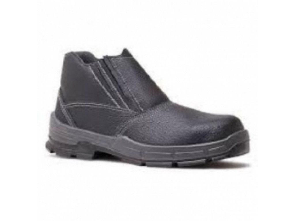Descrição: Calçado de segurança de uso profissional, tipo botina, fechamento em elástico, confeccionado em couro curtido ao cromo, palmilha de montagem em material sintético montada pelo sistema strobel, biqueira de composite, solado de poliuretano monodensidade com resistência ao escorregamento injetado diretamente no cabedal, com sistema de absorção de energia na região do salto, resistente ao óleo combustível.